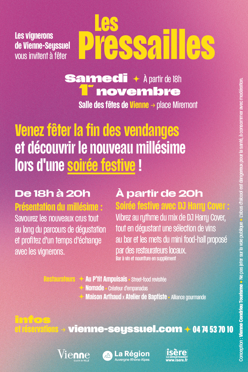 - À partir de 20h : soirée festive animée par le DJ Harry Cover, mini food-hall proposé par des restaurateurs locaux (Au P’tit Ampuisais, Nomade, Maison Arthaud × Atelier de Baptiste) et bar à vins où seront servis les nectars issus du vignoble de Vienne-Seyssuel (dont ceux du Domaine Garon). (Vienne Condrieu Tourisme)